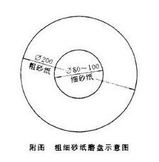常規(guī)磨制金相試樣,采用粗細不同的金相砂紙,手工先粗后細依次磨光,但這種方法不能適應(yīng)我廠大批量制樣要求。經(jīng)試驗,采用一盤貼有兩種粗細不同的水砂紙磨制試樣,效果良好,現(xiàn)介紹如下。將280 #和400#的水砂紙分別剪成200mm 和F80mm圓片,用黃油貼于金相拋光機磨盤上,見附圖。