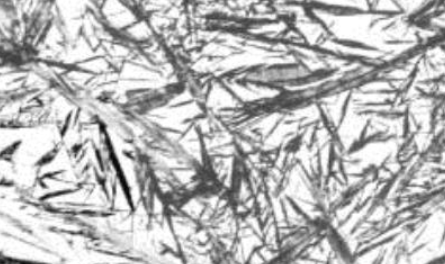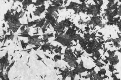 片層狀馬氏體片層狀馬氏體光學顯微鏡下的特征是:細針狀或竹葉狀,片與片之間以一定的夾角相交。一個重要的規(guī)律是:奧氏體的晶粒越粗大,馬氏體的片也越粗大。